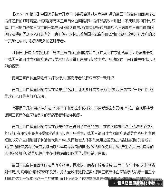 CCTV新闻报道:德国三氧自体血回输疗法治肝病疗效显著