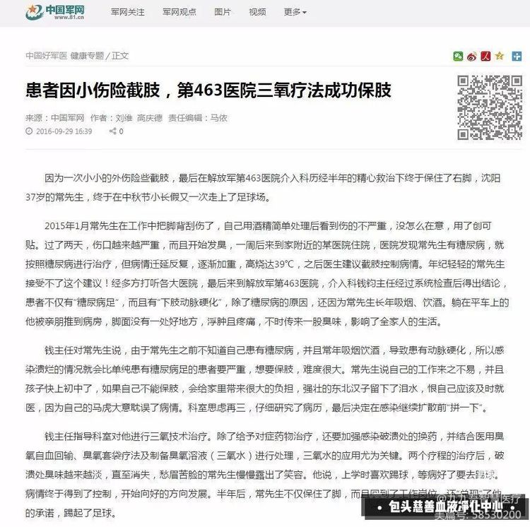 中国军网—患者因小伤险截肢,第463医院三氧疗法成功保肢