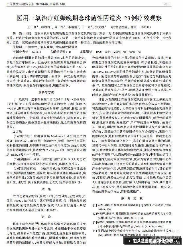 武警总医院——医用三氧治疗妊娠晚期念珠菌性阴道炎 23例患者经治疗后 ,显效 19例 ,有效 4例 ,无效 0例 ,有 效率 100%。